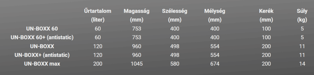 Elérhető az UN-BOXX antisztatikus változata, az UN-BOXX+, különösen épületen belüli használatra tervezve, ami 10^9 felületi ellenállással minimalizálja a hirtelen kisülés kockázatát.